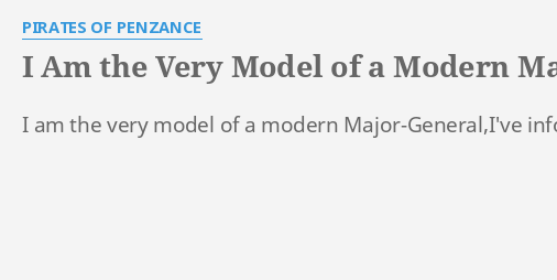 I Am The Very Model Of A Modern Major General Lyrics By Pirates Of Penzance I Am The Very from www.flashlyrics.com It has been called the most famous gilbert and sullivan patter song. I am the very model of a modern major general. We did not find results for: Check spelling or type a new query. Maybe you would like to learn more about one of these? Sung by major general stanley at his first entrance, towards the end of act i, the character introduces himself b.